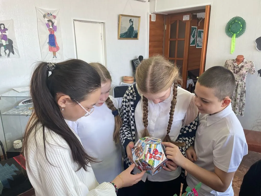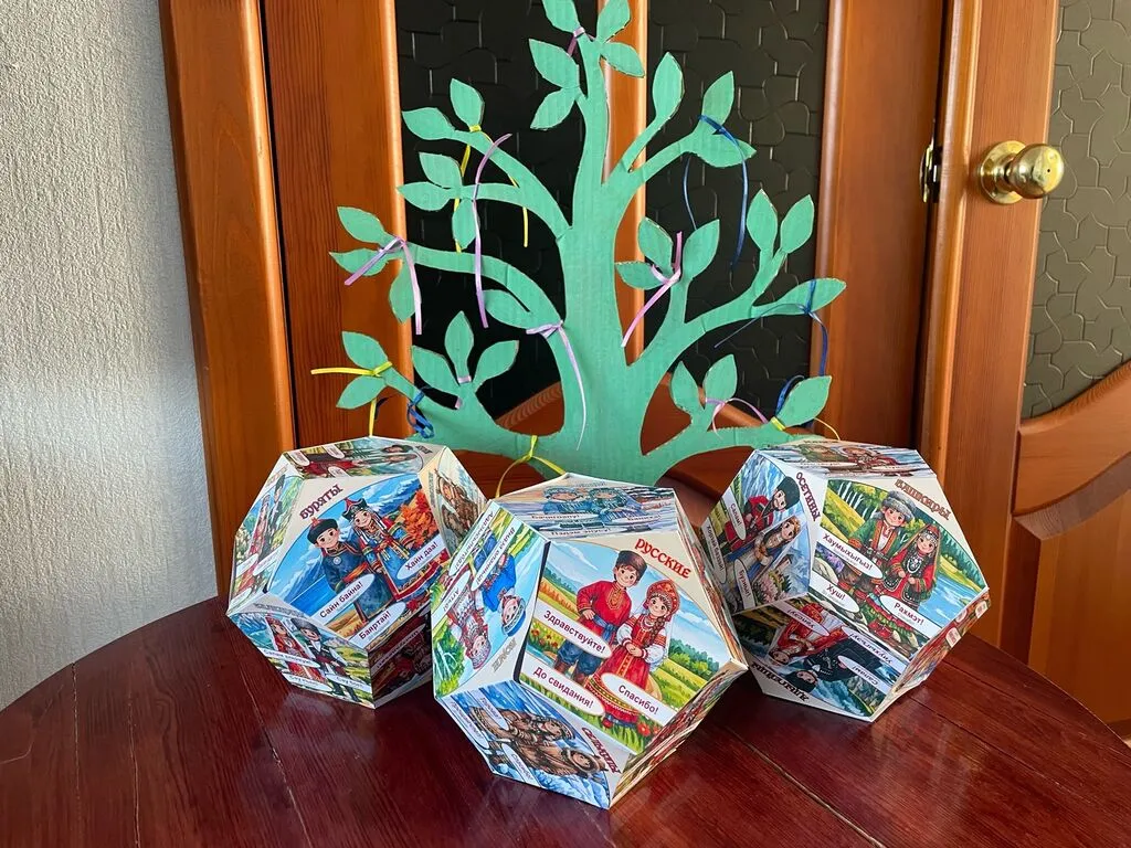 На память о мероприятии сотрудники музея подарили детям объёмные геометрические фигуры. На их гранях можно увидеть, как звучат слова «Здравствуйте!», «Спасибо!» и «До свидания!» на языках 36 народов, проживающих в России.